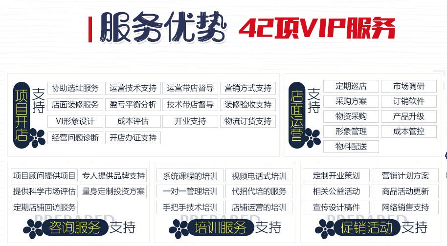 有產(chǎn)品、營銷、培訓、營建、物流、督導、客服、網(wǎng)絡八大系統(tǒng)。產(chǎn)品、技術、店面籌備、開業(yè)運營到管理售后全教,開店忙而不亂 |