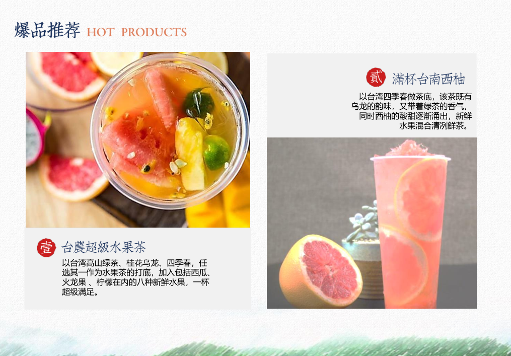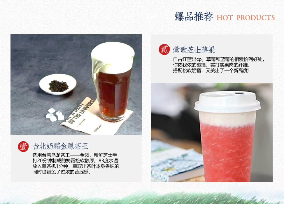 知茶方制茶,呈茶香亦求新生。臺(tái)灣高山族茶——茶浪嘿忠于中國(guó)傳統(tǒng)茶道,專注呈現(xiàn)高山茶香,回歸茶葉原本的味道,甄選最優(yōu)質(zhì)的茶葉,采用最精湛的制茶技藝,打造最醇美原生好茶。在此基礎(chǔ)上融入四季果茶、冷泡茶、奶蓋茶等年輕女性喜愛(ài)的流行元素,以濃郁香醇口感+健康美味、有顏有料食材+富有時(shí)尚品味的品牌形象,打造茶飲新風(fēng)尚,深得大眾喜歡。